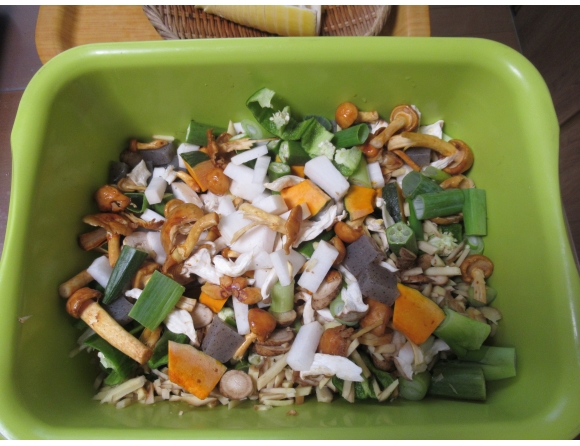 今回の野菜の煮込み。ビーマン (bell pepper)、カボチャ、オクラ (okra)、大根、ゴボウ (burdock)、長ネギ、エリンギ、なめ茸、そしてコンニャクなどで相変わらず内容である。しかし、今回、エノキを買い忘れてしまった。まあ、次の機会に買えばよいわけだが…。