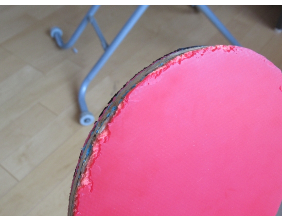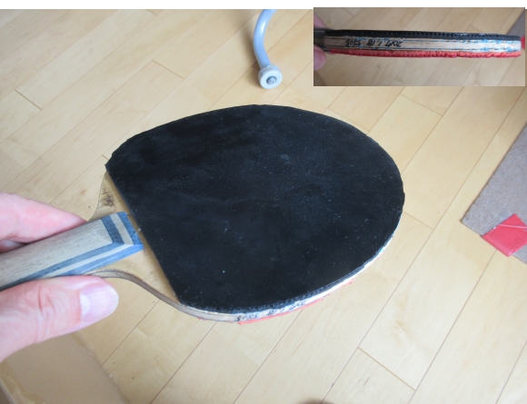 張り替えたラバー。「初めての接着剤でのラバー張りにしては、けっこう上手く貼れたのでは…」などと勝手に思っているが、まあ、そんなに難しい作業ではない。