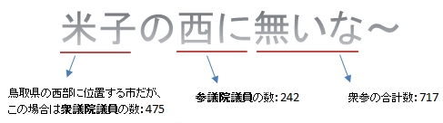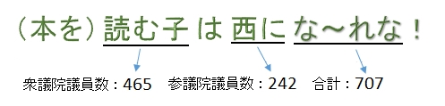 「衆参合わせた国会議員 (Diet member) の数は?」と聞かれて答えられる人はそう多くはないと思われる。そこでだ、その覚え方を伝授しようではないか!ズバリこうだっ!
