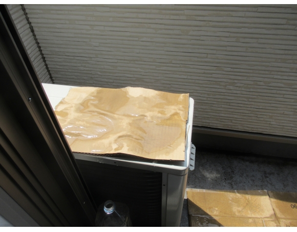 最初は直接水をかけていたが、かけた水はすぐに蒸発するので「段ボールを置き、それに水をかけた方が長く持つのでは…」と思った次第。正直、どれくらいの効果があるのかは不明。
