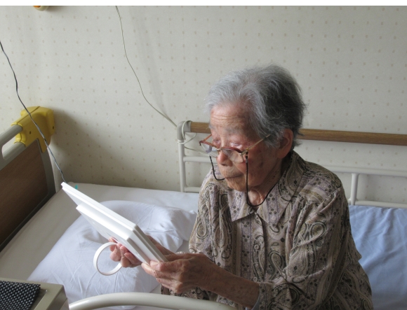 廊下 (corridor) に置かれたソファで会話をした後、すぐ目の前にある叔母の個室 (single room) に移動した。そこで「一応、こういうものも持ってきたんですけど…」と言って、デジタルフォトフレームを箱から出してアダプターをコンセントに差し込んだ。すると自動的にSDカードの中に収められている写真がスライドショーとなって表示された。