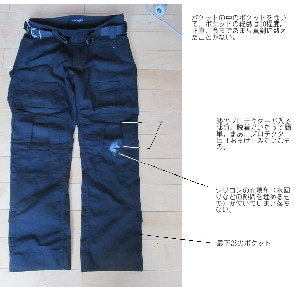 「 化繊 (chemical fiber) を使っているので、生地自体は丈夫は丈夫であるが、それゆえに伸縮性はほぼゼロ。そして、身体にフィットするようなデザインになっているので、膝をかがめるときはけっこう辛い。」