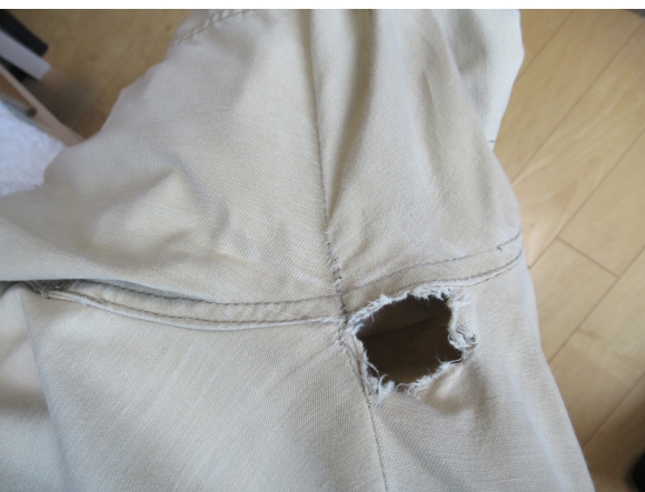 頻繁に(quite open)使うポケットはがほころび始めて取れてきたりしたので、クモの巣テープで接着し、さらに手縫いで対処したことも何回かある。そして、ここにきて2着のうち1着なのだが、お尻の部分に大きな穴があいてしまった。