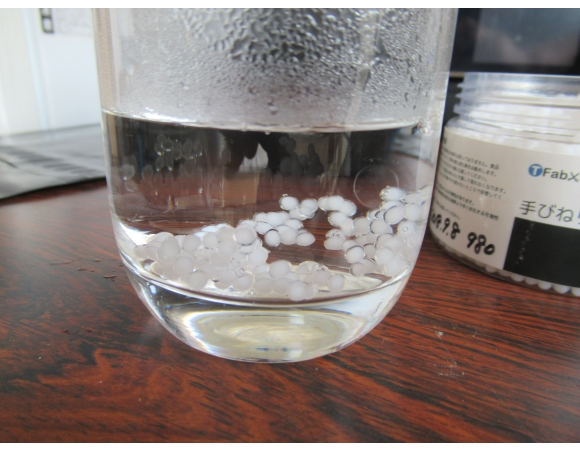 購入したポリカプロラクトン(商品名:手びねりプラスチック)だが、早速「どれどれ…」という感じで少しお湯の中に入れてみた。