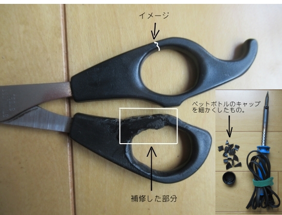 ちょっと昨日の続きみたいになってしまうのだが…。日常のちょっとしたプラスチックの補修なら、おそらくポリカプロラクトンは必要ないだろう。以下は、先日柄の部分を補修したハサミ (scissors) になる。亡き父親が購入したハサミで、おそらく購入してから20年以上は経過しているのではないだろうか…。
