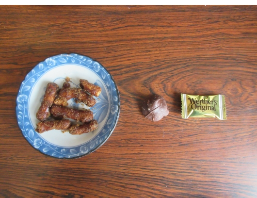 左から、かりんとう、ピーナッツチョコ、そしてキャラメルキャンディーの三兄弟となる。今まではこの三兄弟は大の仲良しだったが、末っ子のキャンディーをときどき仲間はずれにすることに決定した。それから、冬に入ってから夕食後にココアと一緒に三兄弟のいずれかが登場することがあったが、夕食後のココア自体も止めようと思っている。