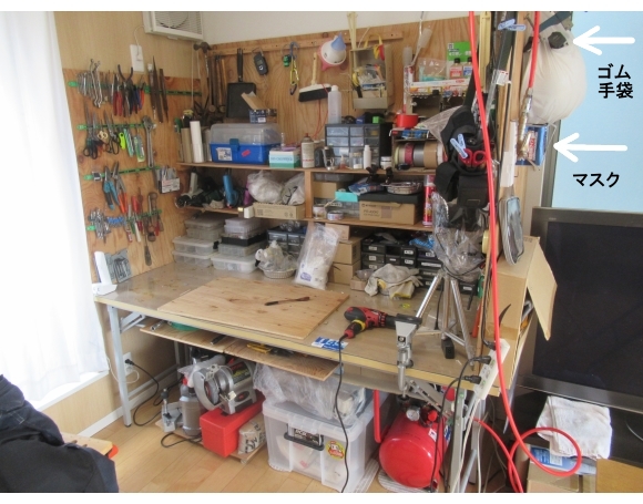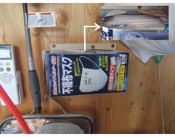 私の部屋の片隅は創作スペースとなっていて、仕切りとなっているベニヤ板にはマスクやゴム手袋の箱が取り付けられている。しょっちゅう使用するものではないが、マスクは冬場に、そしてゴム手袋は汚れものを取り扱う時に使用したりする。