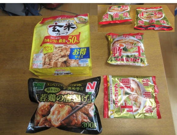 上方向から写しているので、ちょっとその厚みは分かりずらいかもしれないが、右下のラーメンの包装以外は空気を入れ、アイロンで熱圧着 (thermocompression) している。シリアルが入っている包装はジップ付きになるので、熱圧着をしなくても内部に空気を保つことは可能となる。ちなみに、空気を入れるときはストローを用いる。