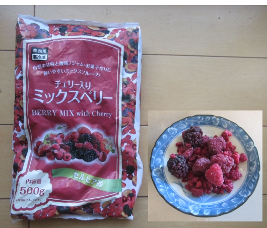 先日、業務用スーパーに行って冷凍食品 (frozen food) コーナーを見ていた時に、ふと目に留まったものがある。それが冷凍のミックスフルーツで「 そうか、冷凍フルーツと言う手もあるかっ!」ととりあえず1袋購入した次第である。値段は、確か430円ほどだったと記憶している。