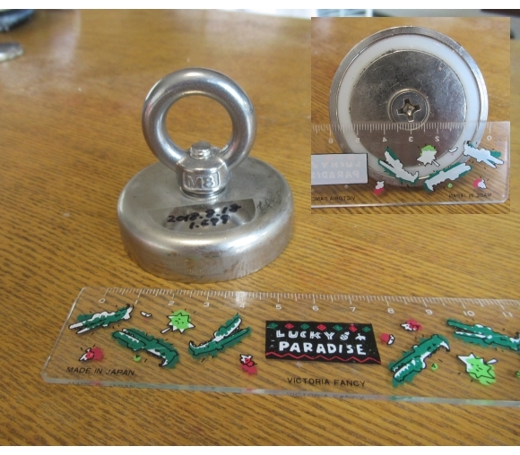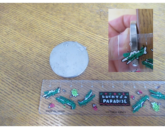 久し振りに購入したものはネオジウム磁石で、直径が39o、厚みが4oとなる。購入は2014年7月で、おそらくアマゾンで購入したに違いない。値段は1,755円で、この値段になると気軽に購入できるようなものではない。かなり「 どうしようかな〜 」と迷った挙句の注文であったはずである。このくらいの大きさがあると磁力もかなり強力となる。