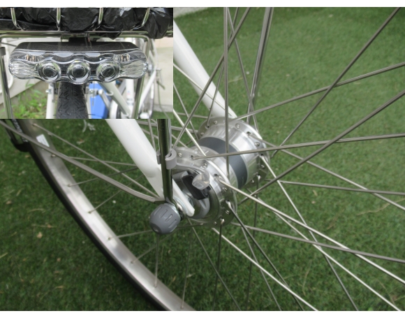 発電はハブダイナモになっていて、今までのように外付けされたものではなくすっきりしている。ライトもLEDが複数付いているので非常に明るい。( 旧車のライトは取り替えたばかりなので、廃棄しないで一応取っておいている。)