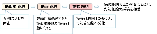 「 筋内膜の中には、筋衛星細胞( 筋サテライト細胞 satellite cell )という、通常活動を休止している細胞があります。 筋線維の壊死 (necrosis) が生じると、活性化し、筋線維の再生が始まります。筋衛星細胞は、筋線維の壊死が発生した約1日後から活性化し (activate) 、筋芽細胞に分化して、増殖を繰り返します。