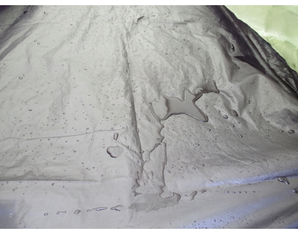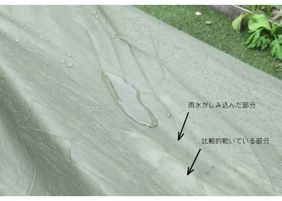 テントに使用されている生地はツルツルしていて一見凹凸 (roughness) はなさそうだが、基本的には化繊の糸を織って製造した布を使っているはず、よって、コーティングがしてあってもある程度の凹凸は避けられない。つまり、雨が降れば糸と糸の間の凹んだ部分に雨がしみ込んでしまい、色むら?ができてしまうことになる。これも「 ある程度は仕方がないか…」とそれほどマイナスには考えないことにしようと思う。そう、プラス思考 (positive thinking) こそが大切なわけだ!