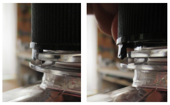 キャップを回して開けようとすると、キャップについている突起と本体の突起がぶつかってすぐに行き止まりとなり、キャップが取れる気配が全くしない。キャップを上に持ち上げることができれば、突起同士のぶつかりは解消されるが、キャップにも本体の容器にもネジの溝があるので上に持ち上げることはできない。
