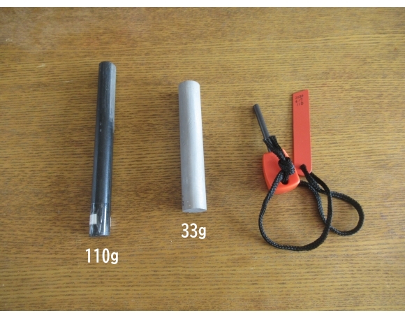 キャンプなどで用いるもので、火花を飛ばして燃料などに着火させる道具。写真左の黒いものは「2015.5¥680」とあるので、おそらく Amazon あたりで購入したものと思われる。そして、右のものは100均で今年購入している。