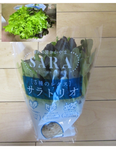 「 サラトリオ 」最近のお気に入りで、スーパーの棚に並んでいるとほぼ「毎回」と言ってよいほど買うようにはしているが、売り切れの時も多い。3種類の野菜が1束になっているなんて「 Nice! 」である。