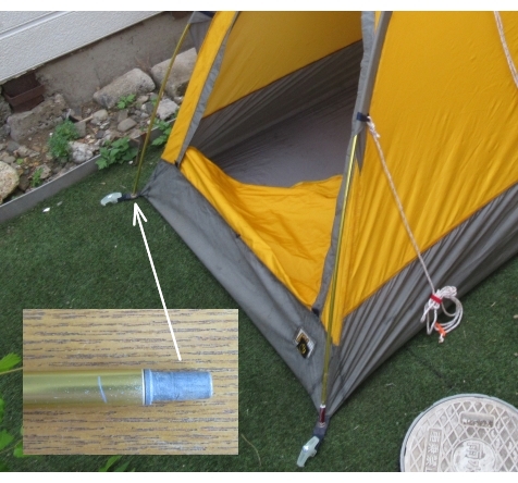 テントのポールの亀裂の補修の次に行った作業なのだが…。通常折りたたまれているポールを組んでいくと1本の長いポールとなる。それで、その両端にはテントのそれぞれの隅に付いている金具 (metal fittings) の輪に固定できるように金具が付いている。( 詳しい名称は不明 )その金具が1ヶ所欠損していて、そのままではテント側の金具の輪にはめこむことができないため、何とかしなければならなかった。