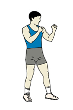 ストレート:上げた左手を下ろし、腰の回転を入れながら右のこぶしを相手のアゴをめがけて出していく。このとき、右足はかかとをフロアにつけず指とその付け根を中心に左にひねると腰の回転が行いやすくなる。また、左手はアゴをガードする。 |