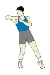 | 2 | ・重心を前にある左足に移しながら、上半身を気持ち左回転させる。 ・視線は後ろにいる「仮想の相手」に向ける。 |
