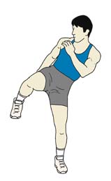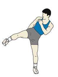 | 3 | ・上半身を左に倒しながら右足を上げていく。 ・蹴る場所は「仮想の相手」の脇腹あたり。 蹴る高さで運動強度の調節ができる。 |