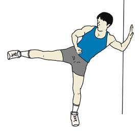 | その他 | ・個人で練習するにあたっては、最初バランスの取れないうちはイラストのように壁などを支えにして練習をしていくとよい。10回程度でもかなりお尻の筋肉を刺激するので、ヒップのシェイプアップには最適。慣れてきたら少しずつ手の補助を外していく。 | |