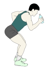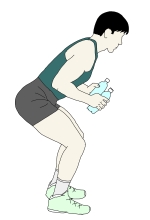 ・それぞれの手にペットボトルを持ち、中腰になって構える。どれだけ腰を落とすかで運動強度の調節ができる。