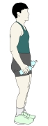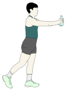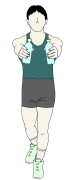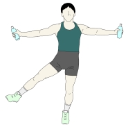 ・フロントレイズをしながら、どちらか一方の足を、なるべく膝を曲げないで後ろに引いていく。(ヒップエクステンション) |