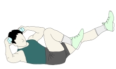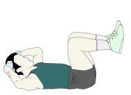 ・それぞれの手でペットボトルを持ってフロアに仰向けになり、膝を90°位に曲げ上げていく。このとき、大腿部が武羅夫に対して垂直になるようにする。 ・手は側頭部に軽く添え、なるべく肘は開いていく。 |