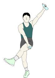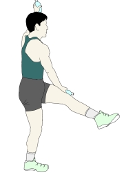 ・右手を斜め下方へ下ろすと同時に、対角の左足を斜め上方に、右手とクロスさせるように持ち上げていく。 ・この時、左足の膝はなるべく伸ばすようにし、上半身はフロアに対して垂直になるように保っていく。 ・エアロビクスの場合は左右交互に行うが、ここでは片側を繰り返してもよいし、左右交互に行っても構わない。 |