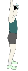 ・足幅は肩幅以上に開き、そして足と手で対角線ができるように両手も大きく開いて上に伸ばしていく。 ・背筋はまっすぐに伸ばす。 |