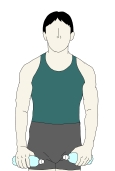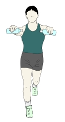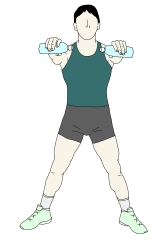 肩を鍛える代表的なエクササイズになります。ペットボトル・エクササイズの場合は、アームカール同様、これ単独で行われることはなく、ワイドスクワットやステーショナリーランジと組み合わされることが多い。