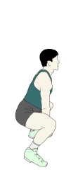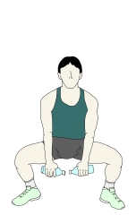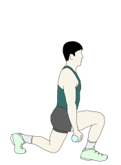 ・それぞれの手にペットボトルを持ち、足を前後に開いた状態から腰を真下に落としていく。 ・どこまで腰を落とすかで強度の調節ができるが、前足の膝の角度が90°が一つの目安となる。 ・上半身はフロアに対して垂直に保ち、後ろ足のかかとはフロアから離す。前足の膝はつま先よりも前に出ないように注意する。 |