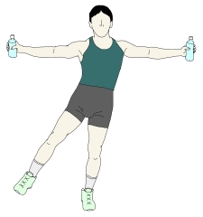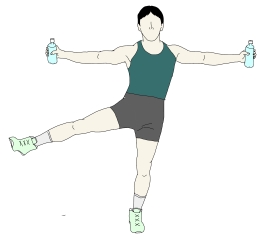 ・それぞれの手にペットボトルを持ち横に広げ、片足をフロアから少し浮かせてバランスを取っていく。 |