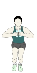 ・足幅は、ピッタリとくっつけるか、こぶし一つ分くらいを開けて腰を落としていく。 ・腕は、肘を曲げ、ペットボトルが胸の前に来るようにして構える。 ・このとき、背筋はまっすぐに伸ばしておく。 |