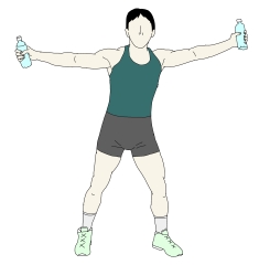 ・足幅を肩幅よりも気持ち広く取り、それぞれの手にペットボトルを持って横に広げていく。 |