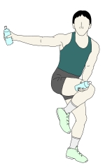 ・片足の膝を曲げながら斜めに持ち上げ(ニーアップ)、対角の腕を、持ち上げた膝と交差するように下ろしていく。 ・バランスを取る力も多少必要となってくるので、慣れないうちはゆっくりとした速さで行うとよい。手と足をしっかりと交差させるという気持ちを持って行っていきたい。 ・左右交互に行う方法もあるが、けっこう慌ただしくなるので、最初は片側だけを繰り返してからもう一方の側を行っていくとよい。 |