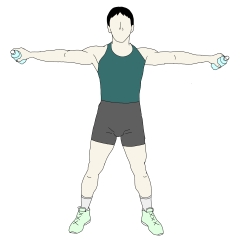 ・足幅を肩幅程度に開き、腕を横に開いていく。腕のラインがフロアと平行になるようにする。 |