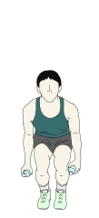 ・足をピッタリとくっつけるか、こぶし一つ分くらいを目安に開けて、それぞれの手にペットボトルを持ち腰を落としていく。(腰を落とす度合いで運動強度が調節できるので、その辺は各人で調節すること) ・このとき背筋はまっすぐに伸ばし、なるべく膝はつま先よりも前に出ないようにしていく。 |