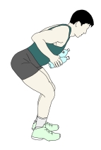 ・それぞれの手にペットボトルを持ち、足幅を腰幅程度に開いて、腰を落としていく。 ・脇を締めて、肘を曲げて構える。このとき背筋はまっすぐに伸ばしていく。 |