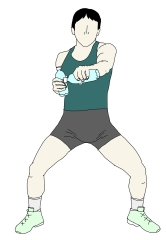 ・それぞれの手にペットボトルを持ち、中腰になって脇を締めて構える。