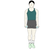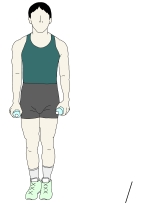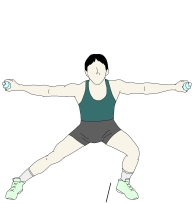 ・サイドレイズをしながら、どちらか一方の足を横に出し腰を落としていく。 ・このとき、背筋はまっすぐに保ち、横にステップした足の膝はつま先よりも前に出ないようにしていく。また、伸ばした足の膝はなるべくまっすぐになるようにする。 |