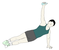 サイドプランクをしながらの腕の上げ下ろしになります。サイドプランク自体もやり方がいくつかあります。慣れて来たら徐々にレベルを上げていってみてください。