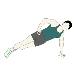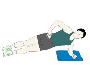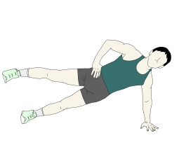 ・肘着きのサイドプランクで、上記のものよりはやり易い形となるが、運動初心者はこの体制でも維持するのは難しいと思われる。 |