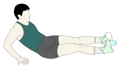 ・ペットボトルを両足で挟み、体を左右どちらかに傾けて足を伸ばしていく。 ・このとき、上半身は後傾させておく。 |