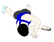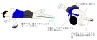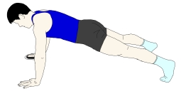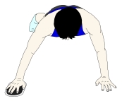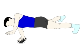 ・どちらか片方の手(イラストでは右手)の下にスライダーを置き、手も足もスタンスを広く取ったプッシュアップポジションを取る。 ・頭からかかとまでまっすぐに保つ。 |