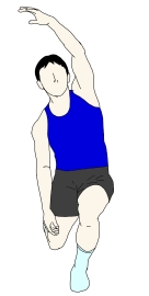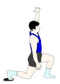 ・左手を上げて、上半身を左に曲げながらバックランジをする。 ・このとき、左の膝がつま先よりも前に出ないように注意する。また、上半身は横から見たときに、前傾も後傾もさせず、あくまでもフロアに対して垂直になるようにする。 |