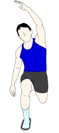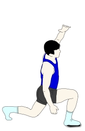 ・左手を上げて、上半身を左に曲げながらフロントランジをする。 ・このとき、右の膝がつま先よりも前に出ないように注意する。また、上半身は横から見たときに、前傾も後傾もさせず、あくまでもフロアに対して垂直になるようにする。 |