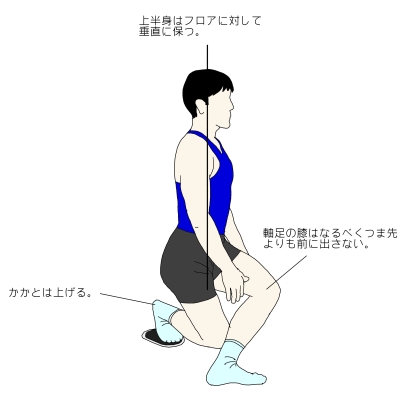 前から見たときに、左右の足がクロスするような形になるバックランジです。他のランジに比べると少し慣れが必要かもしれません。また、いろいろなランジを組み合わせたマルチランジもありますので、ぜひ、行う動作を固定しないでいろいろな方法で身体に刺激を与えてみてください。