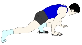 ・対角の手と足(イラストでは右手、左足)にスライダーを置き、手も足もスタンスを広く取ったプッシュアップポジションを取る。 ・頭からかかとまでまっすぐに保つ。 |