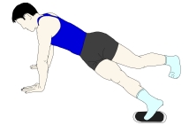 ・右足の下にスライダーを置き、肩幅よりも少し広めに開いたプッシュアップポジションを取る。 ・頭からかかとまでまっすぐに保つ。 |